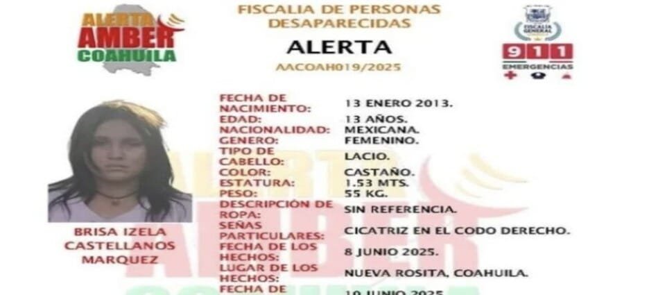 El pasado martes 17 de junio de 2025, la Fiscalía General del Estado de Coahuila informó que fue localizado el cuerpo de una menor de 13 años, identificada como Brisa Izela Castellanos Márquez, en un lote baldío del ejido Santa María, en el municipio de San Juan de Sabinas.
